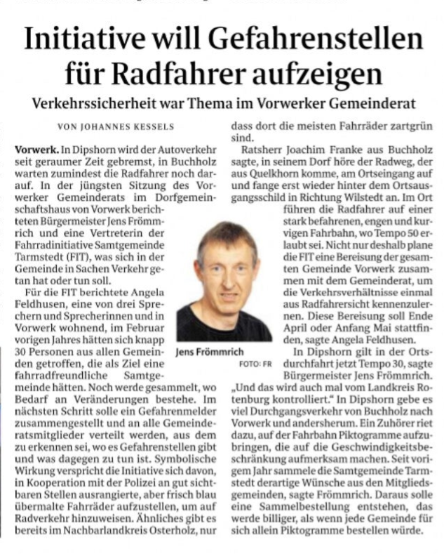 Der Gefahrstellenmelder war vor kurzem Thema im Vorwerker Gemeinderat. Vertreter:innen von FIT haben den Gefahrstellenkatalog für die Gemeinde Vorwerk im Gemeinderat vorgestellt. Thema war dabei vor allem die enge Ortsdurchfahrt in Buchholz, wo es keinen Radweg gibt. Auch aufgrund des kurvigen Verlaufes ist die Ortsdurchfahrt für Radfahrende sehr gefährlich. Um den Gemeinderat für die Knackpunkte in der Fahrradinfrastruktur zu sensibilieren ist eine gemeinsame Bereisung der gesamten Gemeinde Vorwerk geplant, wo FIT und Gemeinderat gefährliche Stellen begutachten werden. Auch in anderen Gemeinden der Samtgemeinde Tarmstedt werden die Ergebnisse des Gefahrstellenmelder aktuell, bzw. in der nächsten Zeit vorgestellt und erörtert.